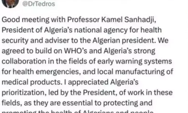 ans un post publié sur la plateforme X via son compte officiel, le docteur Ghebreyesus a également souligné «la qualité des échanges» avec le Professeur Kamel Sanhadji, président de l’Agence nationale de sécurité sanitaire (ANSS), indiquant avoir convenu avec lui de renforcer la solide collaboration entre l’Algérie et l’OMS, notamment dans les domaines des systèmes d’alerte précoce pour les urgences sanitaires et de la fabrication locale de produits médicaux pour la protection de la santé et des Algériens et des populations en Afrique.